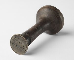 Das Petschaft besteht aus einem gedrechselten Holzgriff mit Knauf und einer aufgesetzten Stempelplatte aus Bronze. In die Stempelplatte ist eine französische Grußformel ("je suis votre &") in schwungvoller Schreibschrift eingraviert, die unter Briefe gesetzt werden konnte. Der Siegelstempel, der wohl für private Korrespondenz verwendet wurde, stammt vermutlich aus dem frühen 19. Jh., als die linksrheinischen Gebiete im Zuge der Revolutionskriege Frankreich angeschlossen wurden.