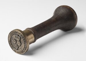 Amtliches Siegel der Bürgermeisterei ("Mairie") Heuchelheim (Heuchelheim-Klingen, heute in Rheinland-Pfalz) mit runder Siegelplatte aus Bronze und gedrechseltem Holzgriff mit Knauf. Das Siegel zeigt drei bourbonische Lilien, darüber eine Krone. Im Zuge der Französischen Revolution wurden das Elsass und angrenzende pfälzische Gebiete in die beiden Départements Haut-Rhin und Bas-Rhin aufgeteilt. Das nördliche Département Bas-Rhin umfasste vier Verwaltungsdistrikte (Wissembourg, Haguenau, Strasbourg und Benfeld), die 1800 zu Arrondissements umstrukturiert werden sollten. Zum Distrikt Wissembourg gehörten fünf Kantone, darunter auch der Kanton Bergzabern. Zu diesem gehörte wiederum die Mairie Heuchelheim. Das Siegel stammt wahrscheinlich aus der kurzen Zeit der Ersten Restauration (1814-1815) unter dem Bourbonenkönig Ludwig XVIII. (1755-1824), in der Heuchelheim noch zu Frankreich gehörte, bevor die Pfalz nach einem kurzem Intermezzo durch Österreich an Bayern kam. [Johanna Kätzel]