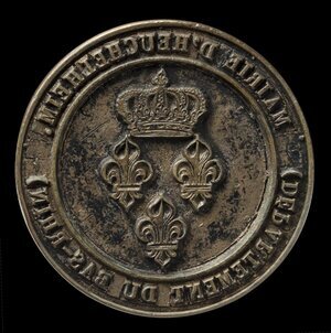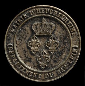 Amtliches Siegel der Bürgermeisterei ("Mairie") Heuchelheim (Heuchelheim-Klingen, heute in Rheinland-Pfalz) mit runder Siegelplatte aus Bronze und gedrechseltem Holzgriff mit Knauf. Das Siegel zeigt drei bourbonische Lilien, darüber eine Krone. Im Zuge der Französischen Revolution wurden das Elsass und angrenzende pfälzische Gebiete in die beiden Départements Haut-Rhin und Bas-Rhin aufgeteilt. Das nördliche Département Bas-Rhin umfasste vier Verwaltungsdistrikte (Wissembourg, Haguenau, Strasbourg und Benfeld), die 1800 zu Arrondissements umstrukturiert werden sollten. Zum Distrikt Wissembourg gehörten fünf Kantone, darunter auch der Kanton Bergzabern. Zu diesem gehörte wiederum die Mairie Heuchelheim. Das Siegel stammt wahrscheinlich aus der kurzen Zeit der Ersten Restauration (1814-1815) unter dem Bourbonenkönig Ludwig XVIII. (1755-1824), in der Heuchelheim noch zu Frankreich gehörte, bevor die Pfalz nach einem kurzem Intermezzo durch Österreich an Bayern kam. [Johanna Kätzel]