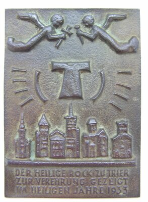 Reliefierte Plakette aus Gusseisen mit der Abbildung des heiligen Rocks anlässlich der Ausstellung 1933. Der ausgebreitete heilige Rock schwebt ohne eine Stange in einem angedeuteten Strahlenkranz über den Trierer Kirchen St. Paulin, Dom, Liebfrauenkirche und St. Matthias. Oberhalb des heiligen schweben zwei stilisierte Engel, die ein Kreuz und einen Nagel halten. Durch einen Grat abgetrennt ist die Inschrift am unteren Rand der Plakette: "DER HEILIGE ROCK ZU TRIER ZUR VEREHRUNG GEZEIGT IM HEILIGEN JAHR 1933" Auf der Rückseite ist der Hersteller in der Plakette verzeichnet: Eisenwerk Mariahütte Kr.[eis] Trier und links unten das Firmenlogo, bestehend aus den ineinander verschlungenen Buchstaben "CGSE". Oben rechts finden wir die Ziffer "1" und auf gleicher Höhe in der Mitte eine Aufhängung aus Eisen. Die Ausstellung des heiligen Rocks 1933 fand im Rahmen der Jahrhundertfeierlichkeiten zum Todesjahr von Jesus im Jahr 33 statt. Der Papst Pius XI. hatte zu diesem Jubiläum aufgerufen. Der heilige Rock wurde vom 23. Juli bis zum 10. September im Dom zu Trier gezeigt. Zu diesem Zeitpunkt blickte die katholische Kirche schon mit Sorge auf die politischen Entwicklungen, die mit dem Wahlsieg der NSDAP und der Machtergreifung durch Adolf Hitler am 30. Januar 1933 auf Deutschland zukommen würde.