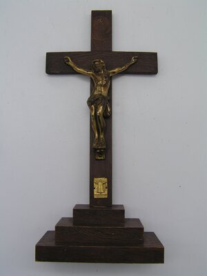 Auf einem dreistufigen Sockel aus Eichenholz steht mittig das Kreuz, an dem der Korpus von Jesus Christus mit zwei Nägeln durch die Hände befestigt ist. Seine Füße sind nebeneinander auf eine Konsole genagelt. Unterhalb der Konsole ist eine kleine rechteckige Plakette mit dem heiligen Rock und der Inschrift "Heiligtumsfahrt / Trier 1933" auf das Kreuz genagelt. Am oberen Ende sind Nagel- und Kratzspuren einer früher vorhandenen Inschrift zu sehen. Auch wenn das Kreuz zum Hinstellen vorgesehen ist, so befindet sich auf der Rückseite oben eine Hängevorrichtung.