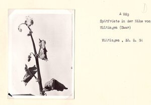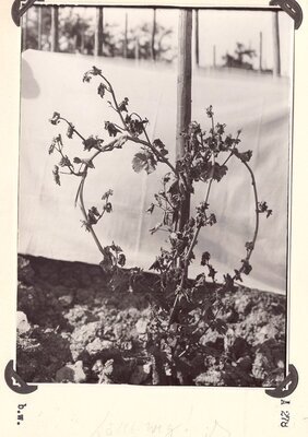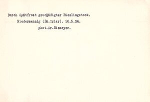 Zu sehen ist ein, herzförmig gebundener, Rebstock (Riesling) mit Frostschäden. Das Foto entstand am 30.05.1934 in der Nähe von Niedermennig (bei Konz). Auf der Rückseite dieser Pappe befinden sich nähere Angaben zu der Aufnahme. Das Foto stammt aus der ehemaligen Landes-Lehr- und Versuchsanstalt (LLVA) in Bernkastel Kues.