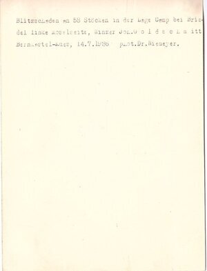 Zu sehen ist das Foto einer Rebe mit Blitzschaden. Lt. Angaben auf der Rückseite waren 58 Stöcke in der Lage Camp bei Briedel betroffen. Diese befindet sich auf der linken Moselseite. Winzer Joh. Goldschmitt, Bernkastel-Kues. Auf der Rückseite dieser Pappe befinden sich nähere Angaben zu der Aufnahme. Das Foto stammt aus der ehemaligen Landes-Lehr- und Versuchsanstalt (LLVA) in Bernkastel Kues.