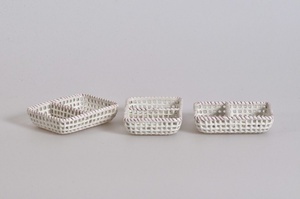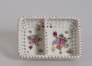 Höchster Porzellanmanufaktur 1760-65 Drei Spielkörbchen aus Porzellan, farbig staffiert mit bunten Blumen. Eins der drei Porzellankörbchen ist unter dem Boden mit einer purpurnen Radmarke bezeichnet. Dazugehörig die passende originale Holzschatulle mit Würfelmarqueterie auf dem Deckel.