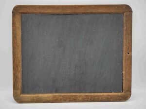 Die Schiefertafel besteht aus einer Schieferplatte, die von einem Holzrahmen eingefasst ist. In die Tafel ist auf der einen Seite ein kariertes Muster für Matheaufgaben eingeritzt, auf der anderen Seite der Tafel ist keine deutliche Linierung vorhanden. Es sind lediglich ganz feine Linien auszumachen, die als Hilfslinien verwendet werden könnten, wenn man die Tafel senkrecht hält, und nicht wie sonst üblich, waagerecht. Das Schiefer der Tafel weist keine bis kaum Gebrauchsspuren auf, der Rahmen jedoch ist etwas abgegriffen. Auch sind ein paar weiße Farbsprenkel auf der Tafel zu finden, sowie der Rest eines Aufklebers auf der Seite mit dem karierten Muster. In den Rahmen ist ein kleines Loch zur Befestigung eines Läppchens gebohrt, er ist gesteckt und geleimt und besitzt keinerlei Prägung eines Herstellers.