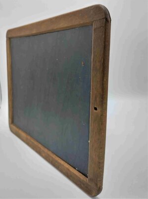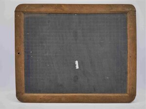 Die Schiefertafel besteht aus einer Schieferplatte, die von einem Holzrahmen eingefasst ist. In die Tafel ist auf der einen Seite ein kariertes Muster für Matheaufgaben eingeritzt, auf der anderen Seite der Tafel ist keine deutliche Linierung vorhanden. Es sind lediglich ganz feine Linien auszumachen, die als Hilfslinien verwendet werden könnten, wenn man die Tafel senkrecht hält, und nicht wie sonst üblich, waagerecht. Das Schiefer der Tafel weist keine bis kaum Gebrauchsspuren auf, der Rahmen jedoch ist etwas abgegriffen. Auch sind ein paar weiße Farbsprenkel auf der Tafel zu finden, sowie der Rest eines Aufklebers auf der Seite mit dem karierten Muster. In den Rahmen ist ein kleines Loch zur Befestigung eines Läppchens gebohrt, er ist gesteckt und geleimt und besitzt keinerlei Prägung eines Herstellers.