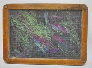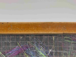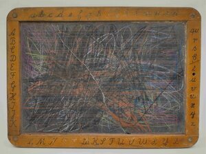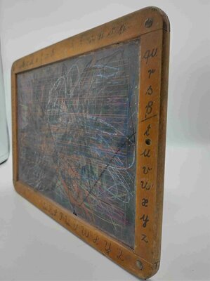 Die Schiefertafel besteht aus einer Schieferplatte, die von einem Holzrahmen eingefasst ist. In die Schiefertafel ist auf der einen Seite ein kariertes Muster und auf der anderen Seite Linien eingeritzt, so dass auf der einen Seite die Matheaufgaben und auf der anderen Seite die übrigen Aufgaben in der Schule bearbeitet werden konnten. Bei den Linien handelt es sich jedoch nicht um einfache Linien, sondern um die Art von Linierung, wie man sie heute auf Kieserblöcken findet, die in der ersten und zweiten Klasse verwendet werden. Durch die Tafel zieht sich beidseitig ein Riss und es ist auch etwas Schiefer auf beiden Seiten der Tafel weggebrochen. Des Weiteren ist die Tafel mit Kreide bunt angemalt. In den Holzrahmen ist ein kleines Loch gebohrt, damit dort ein Läppchen befestigt werden kann. Des Weiteren ist der Rahmen zusammengesteckt und geleimt und es sind Holzdübel zur Verstärkung an den Ecken genutzt worden. Des Weiteren besitzt er verschiedene Prägungen. Auf der Seite mit den Linien ist in den Rahmen das Alphabet in Schreibschrift, einmal in Großbuchstaben und einmal in Kleinbuchstaben eingeprägt. Die Seite mit dem karierten Muster besitzt am oberen Rand die Prägung des Herstellers: "Samos Schreibhilfe" und am unteren Rand ist auf Französisch eingeprägt "Importé d´Allemagne" (Nach Deutschland eingeführt).