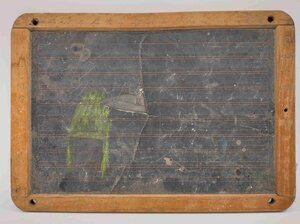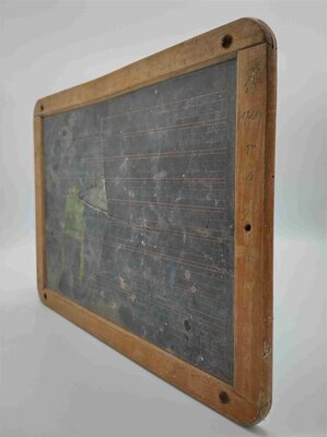 Die Schiefertafel besteht aus einer Schieferplatte, die von einem Holzrahmen eingefasst ist. In die Schiefertafel ist auf der einen Seite ein kariertes Muster und auf der anderen Seite Linien eingeritzt, so dass auf der einen Seite die Matheaufgaben und auf der anderen Seite die übrigen Aufgaben in der Schule bearbeitet werden konnten. Bei den Linien handelt es sich jedoch nicht um einfache Linien, sondern um die Art von Linierung, wie man sie heute auf Kieserblöcken findet, die in der ersten und zweiten Klasse verwendet werden. Durch die Tafel ziehen sich beidseitig Risse und auf der Seite mit der Linierung ist ein größeres Stück Schiefer weggebrochen. Auch ist die Tafel mit Kreide bemalt und es sind einige weiße kleine Farbsprenkel vorhanden. Der Holzrahmen ist gesteckt und geleimt und es ist an jeder Ecke noch ein weiteres Loch vorhanden, wo sich vermutlich ein Holz- oder Kunststoffdübel zur Verstärkung des Rahmens befand. Ansonsten ist in den Rahmen noch ein kleines Löchlein zur Befestigung eines Läppchens oder Schwämmchens gebohrt. Auf der Seite mit der Linierung ist das Alphabet in Schreibschrift in Groß- und Kleinschreibung eingeprägt.