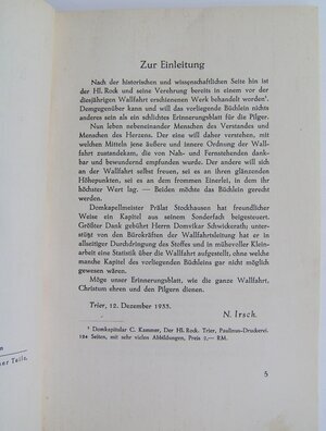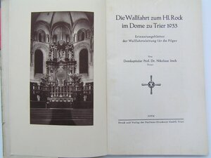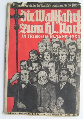 Der Domkapitular Prof. Dr. Nikolaus Irsch hat das Buch (Paperback) "Die Wallfahrt zum Hl. Rock im Dome zu Trier 1933. Erinnerungsblätter der Wallfahrtsleitung für die Pilger" 1934 veröffentlicht. Darin befasst er sich in 4 Teilen mit dem Wallfahrtswesen zum heiligen Rock in Trier in seiner Geschichte, seinen Formen, seinem gottesdienstlichen Aufbau und dem Verlauf der Wallfahrt zum heiligen Rock 1933. Er geht in seinen Auführungen akribisch auf alle Details der Wallfahrt ein, z. B. über die Regelung des Verkehrs in Trier, die Bereitstellung von Pilgerzügen und wie viele Pilger pro Minute (50) am heiligen Rock vorbeigehen müssen; er berichtet von der Anwesenheit des Vizekanzlers von Papen bei den Eröffnungsfeierlichkeiten, gibt eine hoffnungsvolle Einschätzung der neuen Machthaber und eine positive Erinnerung an den Hitlerputsch am 9.11.1923 bei der Betrachtung von Fahnenweihen. Die seelsorgerischen Vorbereitungen werden beschrieben ebenso wie Bedeutung des heiligen Rocks für die gesamte Christenheit. 2.190121 Pilger haben den heiligen Rock bei dieser Wallfahrt gesehen, die per Bus, Bahn und Kleinwagen aus dem In- und Ausland nach Trier kamen. Irsch schreibt von Begegnungen mit einzelnen Pilgern und kommt zu der Erkenntnis, dass man dem "unbekannten Pilger" ein Denkmal setzen müsse. Irsch fasst die Kernaussagen der einzelnen Predigten zusammen, die von Bischöfen aus verschiedenen Bistümern in verschiedenen Trierer Kirchen gehalten wurden, reflektiert über Krankheit und Heilung, die sich einzelne Pilger mit kirchlichen und medizinischen Gutachten durch Berührung erhofften; so berichtet er von mehr als 40 gemeldeten Spontanheilungen. Seine Schlussbilanz betreffend Sinn und Ziel der Wallfahrt ist: "Das Wachstum in der Liebe Christi!" Dann wird der heilige Rock wieder in Seide eingelegt und in die eiserne Truhe gepackt. Paperback, Druck und Verlag der Paulinus-Druckerei GmbH Trier, 111 Seiten, mit einer Abbildung von der Ausstellung des heiligen Rocks im Dom zu Trier. Die Abbildung auf dem Umschlag hat der Trierer Maler und Grafiker Walter Burgermeister (1901-1971) 1934 gestaltet. Es ist in der Ecke rechts unten singiert. Die Abbildung zeigt eine Pilgerschar, die einem Mann folgt, der ein übergroßes Wallfahrtsabzeichen trägt. Alle Pilger tragen ebenfalls Wallfahrtsabzeichen.