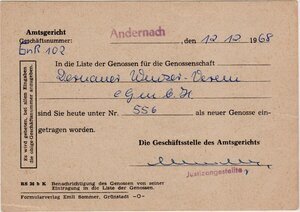 Eintragung in die Liste der Genossen für die Genossenschaft Dernauer Winzerverein 1968