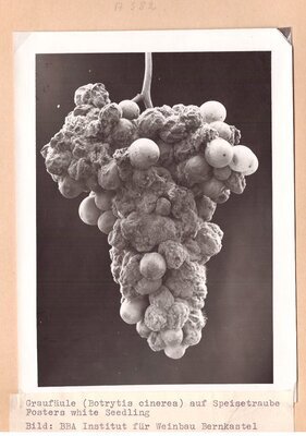 Zu sehen ist Graufäule auf einer Traubenrebe. Rebsorte fosters white seedling. Sämtliche grünen Rebteile können ganzjährig von Grauschimmel befallen werden. Im Frühjahr überzieht der Pilz bei feuchtkühlem Wetter die Knospen und jungen Triebe mit einem grauen Belag. Das Foto stammt aus der ehemaligen Landes-Lehr- und Versuchsanstalt (LLVA) in Bernkastel Kues.