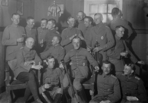 Die schwarz/weiß Aufnahme zeigt eine Gruppe von Soldaten des Leibregiments München. Die Soldaten halten Bierkrügeund zum Teil kleine Fässer in der Hand. Die drei Soldaten in der mittleren Reihe sitzen an einem Tisch und halten Spielkarten in der Hand. Bei dem vierten Soldaten von links in der oberen Reihe handelt es sich um Heinrich Gehrlein. Ein Fass zwischen den beiden in der unteren Reihe liegenden Soldaten trägt die Aufschriften "II. & III. Baion" sowie "Parole 240". Im Historischen Museum der Pfalz war vom 29.4.2014 bis 24.9.2017 die Ausstellung "1914 - 1918. Die Pfalz im Ersten Weltkrieg" zu sehen. Auf einen öffentlichen Aufruf hin meldeten sich zahlreiche Privatpersonen, ihre Objekte wurden in dieser Sammlung erfasst und z. T. auch in der Ausstellung gezeigt. Die Objekte befinden sich im Eigentum der Privatpersonen und sind nicht Teil der Sammlungen des Historischen Museums der Pfalz.