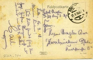 Vorderseite: Fotodruck einer Aufnahme des Neuen Theaters von Lille. Rückseite: Handschriftliche Nachricht in Sütterlin von Carl Angler am 17.09.1918 in Lille an Uwe Angler, Zweibrücken mit Feldpoststempel vom 17.09.1918. Verlag Chr. Trenkler, Leipzig Im Historischen Museum der Pfalz war vom 29.4.2014 bis 24.9.2017 die Ausstellung "1914 - 1918. Die Pfalz im Ersten Weltkrieg" zu sehen. Auf einen öffentlichen Aufruf hin meldeten sich zahlreiche Privatpersonen, ihre Objekte wurden in dieser Sammlung erfasst und z. T. auch in der Ausstellung gezeigt. Die Objekte befinden sich im Eigentum der Privatpersonen und sind nicht Teil der Sammlungen des Historischen Museums der Pfalz.