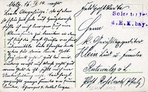 Vorderseite: Kolorierter Fotodruck einer Aufnahme des Hauptbahnhofs von Metz. Rückseite: Handschriftliche Nachricht in Sütterlin von Anthal Eugen am 16.09.1914 in Metz an Ludwig Klein in Rutsweiler an der Lauter. Verlag F. Konrad, Metz Im Historischen Museum der Pfalz war vom 29.4.2014 bis 24.9.2017 die Ausstellung "1914 - 1918. Die Pfalz im Ersten Weltkrieg" zu sehen. Auf einen öffentlichen Aufruf hin meldeten sich zahlreiche Privatpersonen, ihre Objekte wurden in dieser Sammlung erfasst und z. T. auch in der Ausstellung gezeigt. Die Objekte befinden sich im Eigentum der Privatpersonen und sind nicht Teil der Sammlungen des Historischen Museums der Pfalz.