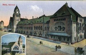 Vorderseite: Kolorierter Fotodruck einer Aufnahme des Hauptbahnhofs von Metz. Rückseite: Handschriftliche Nachricht in Sütterlin von Kls. O. Gerstmann am 1.06.1915 an Luise Gerstmann in Speyer. Der Absender ist nicht eindeutig zu transkribieren. Briefstempel: Ers. - Batl. bayr. Res. Inf. Regt.5, 5. Kompagnie Verlag Gerhard Blümlein & Co., Frankfurt am Main Im Historischen Museum der Pfalz war vom 29.4.2014 bis 24.9.2017 die Ausstellung "1914 - 1918. Die Pfalz im Ersten Weltkrieg" zu sehen. Auf einen öffentlichen Aufruf hin meldeten sich zahlreiche Privatpersonen, ihre Objekte wurden in dieser Sammlung erfasst und z. T. auch in der Ausstellung gezeigt. Die Objekte befinden sich im Eigentum der Privatpersonen und sind nicht Teil der Sammlungen des Historischen Museums der Pfalz.