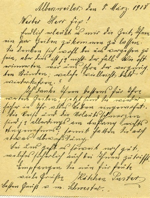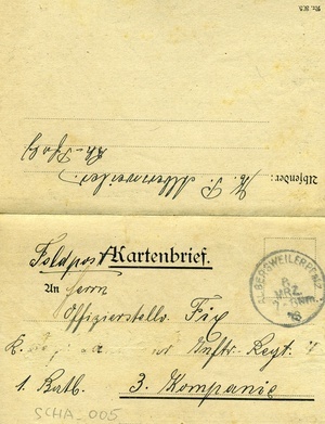 Vorderseite: Handschriftlich in Sütterlin verfasster Empfänger und Absender. Empfänger: Offizierstellv. Fix, Königl. bayr. Inftr. Regt. 1. Batl, 3. Kompanie (lückenhaft, unleserlich) Absender: K. P., Albersweiler Rückseite: Handschriftlich in Sütterlin verfasste Nachricht von Kätchen Puster am 8. März 1918 aus Albersweiler. Im Historischen Museum der Pfalz war vom 29.4.2014 bis 24.9.2017 die Ausstellung "1914 - 1918. Die Pfalz im Ersten Weltkrieg" zu sehen. Auf einen öffentlichen Aufruf hin meldeten sich zahlreiche Privatpersonen, ihre Objekte wurden in dieser Sammlung erfasst und z. T. auch in der Ausstellung gezeigt. Die Objekte befinden sich im Eigentum der Privatpersonen und sind nicht Teil der Sammlungen des Historischen Museums der Pfalz.