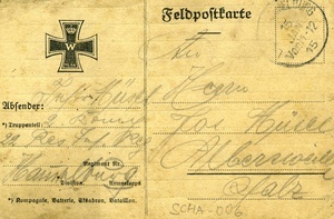 Vorderseite: Eisernes Kreuz, 1914 Handschriftlich verfasster Absender und Empfänger, welche bis auf den Teil des Nachnamens "Hü..." nicht zu entziffern sind. Truppenteil des Absenders ist das königl. bayr. 22. Res. Inf. Regiment. Ort des Absenders ist Hammelburg. Ort des Empfängers ist Albersweiler. Rückseite: Handschriftlich verfasste Nachricht vom 14.01.1915. Im Historischen Museum der Pfalz war vom 29.4.2014 bis 24.9.2017 die Ausstellung "1914 - 1918. Die Pfalz im Ersten Weltkrieg" zu sehen. Auf einen öffentlichen Aufruf hin meldeten sich zahlreiche Privatpersonen, ihre Objekte wurden in dieser Sammlung erfasst und z. T. auch in der Ausstellung gezeigt. Die Objekte befinden sich im Eigentum der Privatpersonen und sind nicht Teil der Sammlungen des Historischen Museums der Pfalz.