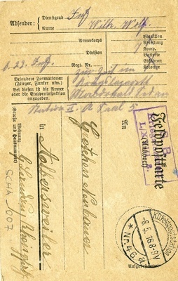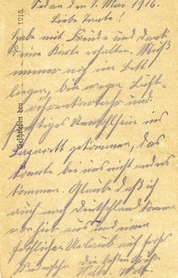 Vorderseite: Handschriftlich in Sütterlin verfasster Absender und Empfänger mit Poststempel vom 8.05.1916. Absender: Infanterist Wilhelm Wolf aus dem Kriegslazarett. Ort ist nicht zu transkribieren. Empfänger: Gretchen Neubauer in Albersweiler bei Landau. Rückseite: Handschriftlich verfasste Nachricht von Wilhelm Wolf an Gretchen Neubauer vom 7.05.1916. Im Historischen Museum der Pfalz war vom 29.4.2014 bis 24.9.2017 die Ausstellung "1914 - 1918. Die Pfalz im Ersten Weltkrieg" zu sehen. Auf einen öffentlichen Aufruf hin meldeten sich zahlreiche Privatpersonen, ihre Objekte wurden in dieser Sammlung erfasst und z. T. auch in der Ausstellung gezeigt. Die Objekte befinden sich im Eigentum der Privatpersonen und sind nicht Teil der Sammlungen des Historischen Museums der Pfalz.
