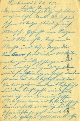 Vorderseite: Handschriftlich in Sütterlin verfasster Absender und Empfänger mit Poststempel vom 31.10.1915. Absender: Wilhelm Wolf Empfänger: Fräulein Gretchen Neubauer, Albersweiler bei Landau (Pfalz) Rückseite: Handschriftlich in Sütterlin verfasste Nachricht von Wilhelm Wolf an Gretchen Neubauer vom 28.10.1915. Im Historischen Museum der Pfalz war vom 29.4.2014 bis 24.9.2017 die Ausstellung "1914 - 1918. Die Pfalz im Ersten Weltkrieg" zu sehen. Auf einen öffentlichen Aufruf hin meldeten sich zahlreiche Privatpersonen, ihre Objekte wurden in dieser Sammlung erfasst und z. T. auch in der Ausstellung gezeigt. Die Objekte befinden sich im Eigentum der Privatpersonen und sind nicht Teil der Sammlungen des Historischen Museums der Pfalz.