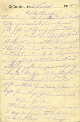 Vorderseite: Handschriftlich in Sütterlin verfasster Absender und Empfänger. Absender: Wilhelm Wolf Empfänger: Fräulein Gretchen Neubauer, Albersweiler bei Landau (Pfalz) Rückseite: Handschriftlich in Sütterlin verfasste Nachricht von Wilhelm Wolf an Gretchen Neubauer vom 3.06.1915. Im Historischen Museum der Pfalz war vom 29.4.2014 bis 24.9.2017 die Ausstellung "1914 - 1918. Die Pfalz im Ersten Weltkrieg" zu sehen. Auf einen öffentlichen Aufruf hin meldeten sich zahlreiche Privatpersonen, ihre Objekte wurden in dieser Sammlung erfasst und z. T. auch in der Ausstellung gezeigt. Die Objekte befinden sich im Eigentum der Privatpersonen und sind nicht Teil der Sammlungen des Historischen Museums der Pfalz.
