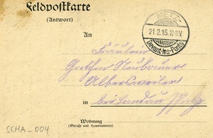 Vorderseite: Handschriftlich in Sütterlin verfasster Absender und Empfänger. Poststempel vom 16.01.1916 Absender: Wilhelm Wolf Empfänger: Fräulein Gretchen Neubauer, Albersweiler bei Landau (Pfalz) Rückseite: Handschriftlich in Sütterlin verfasste Nachricht von Wilhelm Wolf an Gretchen Neubauer vom 14.01.1916. Im Historischen Museum der Pfalz war vom 29.4.2014 bis 24.9.2017 die Ausstellung "1914 - 1918. Die Pfalz im Ersten Weltkrieg" zu sehen. Auf einen öffentlichen Aufruf hin meldeten sich zahlreiche Privatpersonen, ihre Objekte wurden in dieser Sammlung erfasst und z. T. auch in der Ausstellung gezeigt. Die Objekte befinden sich im Eigentum der Privatpersonen und sind nicht Teil der Sammlungen des Historischen Museums der Pfalz.