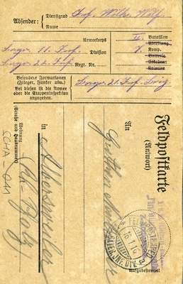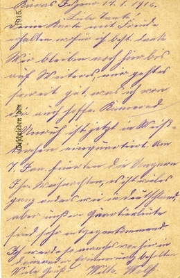 Vorderseite: Handschriftlich in Sütterlin verfasster Absender und Empfänger. Poststempel vom 16.01.1916 Absender: Wilhelm Wolf Empfänger: Fräulein Gretchen Neubauer, Albersweiler bei Landau (Pfalz) Rückseite: Handschriftlich in Sütterlin verfasste Nachricht von Wilhelm Wolf an Gretchen Neubauer vom 14.01.1916. Im Historischen Museum der Pfalz war vom 29.4.2014 bis 24.9.2017 die Ausstellung "1914 - 1918. Die Pfalz im Ersten Weltkrieg" zu sehen. Auf einen öffentlichen Aufruf hin meldeten sich zahlreiche Privatpersonen, ihre Objekte wurden in dieser Sammlung erfasst und z. T. auch in der Ausstellung gezeigt. Die Objekte befinden sich im Eigentum der Privatpersonen und sind nicht Teil der Sammlungen des Historischen Museums der Pfalz.