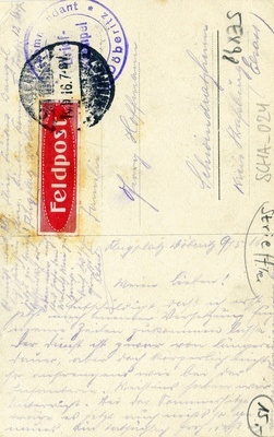 Die Vorderseite der gelaufenen Bildpostkarte zeigt als Motiv den Druck eines Gemäldes des Künstlers Heinrich Strieffler. Dargestellt ist eine Szene, bei der Schwestern des Roten Kreuzes deutsche Soldaten verabschieden indem sie diesen Leibesgaben reichen und mit Taschentüchern hinterherwinken. Ausgelassen gestikulierend stehen die Soldaten auf einem mit Laub geschmückten Waggon, der mit Artilleriegeschützen beladen ist. Auf Rückseite befindet sich eine handschriftlichen Nachricht in Sütterlin. Als Empfänger ist Familie Georg Hoffmann in Sch...heim Kreis Straßburg/Elsass eingetragen. Der Feldpoststempel ist vom 16.5.1916. Im Historischen Museum der Pfalz war vom 29.4.2014 bis 24.9.2017 die Ausstellung "1914 - 1918. Die Pfalz im Ersten Weltkrieg" zu sehen. Auf einen öffentlichen Aufruf hin meldeten sich zahlreiche Privatpersonen, ihre Objekte wurden in dieser Sammlung erfasst und z. T. auch in der Ausstellung gezeigt. Die Objekte befinden sich im Eigentum der Privatpersonen und sind nicht Teil der Sammlungen des Historischen Museums der Pfalz.