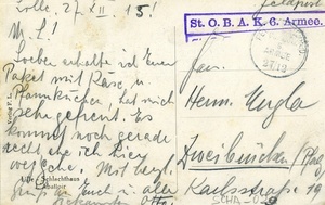 Die Vorderseite der Fotopostkarte zeigt eine Aufnahme von deutschen Soldaten, welche zusammen mit französischen Zivilisten vor dem Eingangstor des Schlachthofs in Lille posieren. Auf der Rückseite befindet sich eine handschriftliche Nachricht aus Lille vom 27.12.1915. Der Absender ist ein gewisser Otto. Empfänger ist die Familie H. Angler in Zweibrücken (Pfalz), Karlstraße19. Verlag F.L. Im Historischen Museum der Pfalz war vom 29.4.2014 bis 24.9.2017 die Ausstellung "1914 - 1918. Die Pfalz im Ersten Weltkrieg" zu sehen. Auf einen öffentlichen Aufruf hin meldeten sich zahlreiche Privatpersonen, ihre Objekte wurden in dieser Sammlung erfasst und z. T. auch in der Ausstellung gezeigt. Die Objekte befinden sich im Eigentum der Privatpersonen und sind nicht Teil der Sammlungen des Historischen Museums der Pfalz.