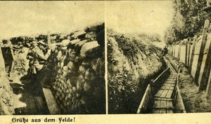Die gelaufene Fotopostkarte zeigt auf der Vorderseite zwei Aufnahmen von Schützengräben. Der Schützengraben auf der rechten Aufnahme ist verlassen, in dem anderen befinden sich zwei deutsche Soldaten von denen einer mit einem Scherenfernrohr Ausschau hält. Auf der Rückseite befindet sich eine handschriftlich verfasste Nachricht aus Capatinesti (Rumänien) vom 2.2.1917(18?). Der Absender ist ein gewisser Karl. Der Empfänger ist Familie H. Angler in Zweibrücken (Pfalz), Karlstraße 19. Der Feldpoststempel ist vom 3.2.1918. Im Historischen Museum der Pfalz war vom 29.4.2014 bis 24.9.2017 die Ausstellung "1914 - 1918. Die Pfalz im Ersten Weltkrieg" zu sehen. Auf einen öffentlichen Aufruf hin meldeten sich zahlreiche Privatpersonen, ihre Objekte wurden in dieser Sammlung erfasst und z. T. auch in der Ausstellung gezeigt. Die Objekte befinden sich im Eigentum der Privatpersonen und sind nicht Teil der Sammlungen des Historischen Museums der Pfalz.