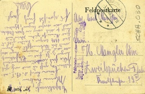 Die gelaufene Fotopostkarte zeigt auf der Vorderseite zwei Aufnahmen von Schützengräben. Der Schützengraben auf der rechten Aufnahme ist verlassen, in dem anderen befinden sich zwei deutsche Soldaten von denen einer mit einem Scherenfernrohr Ausschau hält. Auf der Rückseite befindet sich eine handschriftlich verfasste Nachricht aus Capatinesti (Rumänien) vom 2.2.1917(18?). Der Absender ist ein gewisser Karl. Der Empfänger ist Familie H. Angler in Zweibrücken (Pfalz), Karlstraße 19. Der Feldpoststempel ist vom 3.2.1918. Im Historischen Museum der Pfalz war vom 29.4.2014 bis 24.9.2017 die Ausstellung "1914 - 1918. Die Pfalz im Ersten Weltkrieg" zu sehen. Auf einen öffentlichen Aufruf hin meldeten sich zahlreiche Privatpersonen, ihre Objekte wurden in dieser Sammlung erfasst und z. T. auch in der Ausstellung gezeigt. Die Objekte befinden sich im Eigentum der Privatpersonen und sind nicht Teil der Sammlungen des Historischen Museums der Pfalz.