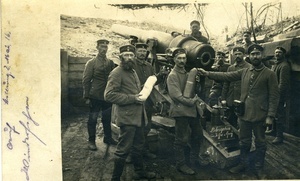 Die Vorderseite Postkarte zeigt die Aufnahme einer Gruppe deutscher Soldaten beim Laden eines Artilleriegeschützes. Am Fuß des Geschützes ist ein Schild mit der Aufschrift "Liebesgaben für Joffre und Grey" angebracht. Auf der Rückseite befindet sich eine handschriftliche Nachricht von einem gewissen Herr Johann. Der Empfänger ist Familie Adolf Mast in Albersweiler bei Landau (Pfalz). Der Poststempel ist vom 2.05.1916. Im Historischen Museum der Pfalz war vom 29.4.2014 bis 24.9.2017 die Ausstellung "1914 - 1918. Die Pfalz im Ersten Weltkrieg" zu sehen. Auf einen öffentlichen Aufruf hin meldeten sich zahlreiche Privatpersonen, ihre Objekte wurden in dieser Sammlung erfasst und z. T. auch in der Ausstellung gezeigt. Die Objekte befinden sich im Eigentum der Privatpersonen und sind nicht Teil der Sammlungen des Historischen Museums der Pfalz.