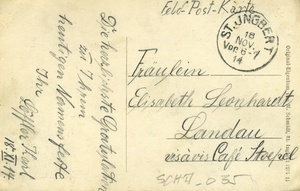 Die Vorderseite der Postkarte zeigt den Fotodruck einer Aufnahme des St. Fidelishaus in St. Ingbert. Der Absender der Postkarte hat hier im oberen Teil der Vorderseite eine handschriftliche Notiz plaziert. Auf der Rückseite der Postkarte befindet sich die handschriftlich verfasste Nachricht des Absenders Karl Löffler vom 18.11.1914. Der Empfänger ist Fräulein Elisabeth Leonhardt in Landau (Pfalz). Im Historischen Museum der Pfalz war vom 29.4.2014 bis 24.9.2017 die Ausstellung "1914 - 1918. Die Pfalz im Ersten Weltkrieg" zu sehen. Auf einen öffentlichen Aufruf hin meldeten sich zahlreiche Privatpersonen, ihre Objekte wurden in dieser Sammlung erfasst und z. T. auch in der Ausstellung gezeigt. Die Objekte befinden sich im Eigentum der Privatpersonen und sind nicht Teil der Sammlungen des Historischen Museums der Pfalz.