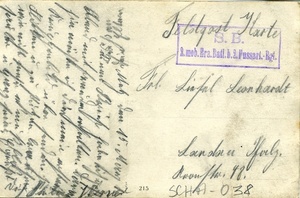 Die Vorderseite der Feldpostkarte zeigt die Aufnahme einer Gruppe von 11 deutschen Soldaten. Auf der Rückseite befindet sich eine handschriftliche Nachricht an Lisbeth Leonhardt in Landau (Pfalz). Der Absender ist nicht zu rekonstruieren. Ort des Absenders ist Metz mit dem Datum des 13. März ohne Jahr. Im Historischen Museum der Pfalz war vom 29.4.2014 bis 24.9.2017 die Ausstellung "1914 - 1918. Die Pfalz im Ersten Weltkrieg" zu sehen. Auf einen öffentlichen Aufruf hin meldeten sich zahlreiche Privatpersonen, ihre Objekte wurden in dieser Sammlung erfasst und z. T. auch in der Ausstellung gezeigt. Die Objekte befinden sich im Eigentum der Privatpersonen und sind nicht Teil der Sammlungen des Historischen Museums der Pfalz.