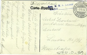 Die Vorderseite der Feldpostkarte zeigt eine Aufnahme der Fosse (Grube) No.15 im nordfranzösischen Lens (Pas de Calais) mit ihren zwei markanten 75 Meter hohen Fördertürmen. 1841 wurden in der Region um Lens ergiebige Steinkohlevorkommen entdeckt und in der Folgezeit zahlreiche Bergwerke eingerichtet. Die Grube No. 15 von Lens wurde 1907 eröffnet. Wie viele andere Gruben der Region wurde auch die Fosse No. 15 als wichtige Industrieanlage während des Ersten Weltkrieges gezielt zerstört. Nach dem Krieg wurde die Mine wieder aufgebaut, aber bereits 1937 geschlossen. Der Kohlebergbau dieser Region ist heute zwar nicht mehr von wirtschaftlicher Bedeutung, das Nordfranzösische Kohlerevier wurde aber 2012 zum UNESCO-Welterbe ernannt. Die Postkarte ist ein Zeugnis für die Industriearchitektur des frühen 20. Jh. und für die in der Region und die damalige Zeit einzigartige Doppelturmanlage der Fosse No. 15. Auf der Rückseite der Karte befindet sich die handschriftliche Nachricht von Fritz Ziegler an Lisbeth Leonhardt in Landau (Pfalz) mit dem Feldpoststempel vom 1.10.1915. [Johanna Kätzel] Im Historischen Museum der Pfalz war vom 29.4.2014 bis 24.9.2017 die Ausstellung "1914 - 1918. Die Pfalz im Ersten Weltkrieg" zu sehen. Auf einen öffentlichen Aufruf hin meldeten sich zahlreiche Privatpersonen, ihre Objekte wurden in dieser Sammlung erfasst und z. T. auch in der Ausstellung gezeigt. Die Objekte befinden sich im Eigentum der Privatpersonen und sind nicht Teil der Sammlungen des Historischen Museums der Pfalz.