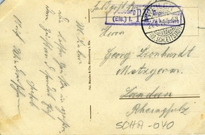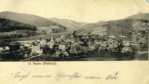Die Vorderseite der Feldpostkarte zeigt eine Aufnahme des Ortes St. Martin (heute Saint-Martin) im Weilertal (heute Vallée de Villé) im Elsass. Zur Zeit der Aufnahme gehörte St. Martin zum Reichsland Elsaß-Lothringen. Heute gehört der wieder französische Ort zum Département Bas-Rhin in der Region Grand Est. Auf der Rückseite befindet sich eine handschriftliche Nachricht von Jakob (Leonhardt?) an Georg Leonhardt in Landau (Pfalz) mit dem Poststempel vom 24.8.1914. Die Postkarte wurde bei Jul. Manias & Cie. in Straßburg gedruckt. Der Verlag wurde 1891 von dem aus Kehl in Baden stammenden Julius Manias (1866-1944) als "Graphische Kunstdruckerei" gegründet, die sich bald auf Fotopostkarten mit vorwiegend architektonischen Motiven aus Frankreich, Deutschland und den deutschen Kolonien in Afrika spezialisierte. [Johanna Kätzel] Im Historischen Museum der Pfalz war vom 29.4.2014 bis 24.9.2017 die Ausstellung "1914 - 1918. Die Pfalz im Ersten Weltkrieg" zu sehen. Auf einen öffentlichen Aufruf hin meldeten sich zahlreiche Privatpersonen, ihre Objekte wurden in dieser Sammlung erfasst und z. T. auch in der Ausstellung gezeigt. Die Objekte befinden sich im Eigentum der Privatpersonen und sind nicht Teil der Sammlungen des Historischen Museums der Pfalz.
