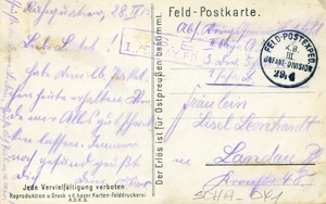 Die Vorderseite der Feldpostkarte zeigt den Druck einer Karikatur des Generalfeldmarschalls von Hindenburg, welcher überlebensgroß dargestellt eine flüchtende Menschenmenge mit seinen Händen zusammentreibt. Auf der Rückseite befindet sich eine handschriftlich verfasste Nachricht von Artur (?) an Fräulein Lisel Leonhardt in Landau (Pfalz) mit dem Feldpoststempel vom 29.4.1915. Der Erlös ist für Ostpreußen bestimmt. Reproduktion u. Druck v.d. bayer. Karten-Felddruckerei A.O.K.6 Im Historischen Museum der Pfalz war vom 29.4.2014 bis 24.9.2017 die Ausstellung "1914 - 1918. Die Pfalz im Ersten Weltkrieg" zu sehen. Auf einen öffentlichen Aufruf hin meldeten sich zahlreiche Privatpersonen, ihre Objekte wurden in dieser Sammlung erfasst und z. T. auch in der Ausstellung gezeigt. Die Objekte befinden sich im Eigentum der Privatpersonen und sind nicht Teil der Sammlungen des Historischen Museums der Pfalz.