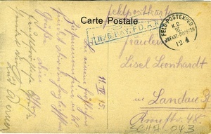 Die Vorderseite der Feldpostkarte zeigt einen Druck der Aufnahme des Place St. Michel mit dem Hotel de Ville in Wervicq. Wervicq (franz.) oder Wervik (niederl.) ist eine belgische Stadt im Süden der Region Flandern. Auf der Rückseite befindet sich eine am 11.04.1915 handschriftlich verfasste Nachricht von Lud. Werner an Fräulein Lisel Leonhardt in Landau (Pfalz). Der Feldpoststempel ist vom 12.4.1915. Im Historischen Museum der Pfalz war vom 29.4.2014 bis 24.9.2017 die Ausstellung "1914 - 1918. Die Pfalz im Ersten Weltkrieg" zu sehen. Auf einen öffentlichen Aufruf hin meldeten sich zahlreiche Privatpersonen, ihre Objekte wurden in dieser Sammlung erfasst und z. T. auch in der Ausstellung gezeigt. Die Objekte befinden sich im Eigentum der Privatpersonen und sind nicht Teil der Sammlungen des Historischen Museums der Pfalz.
