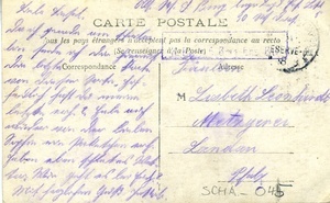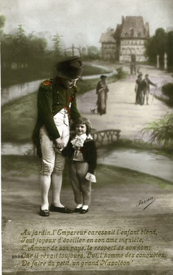 Die Vorderseite der Feldpostkarte zeigt den kolorierten Druck einer gestellten Szene vor der gemalten Kulisse einer Gartenszenerie. Ein Schauspieler in Gestalt von Napoleon I. blickt zu einem Kind, das seinen Sohn Napoleon Franz Joseph Karl Bonaparte (1811-1832) darstellen soll. In der unteren Bildhälfte ist ein französisches Gedicht abgedruckt, in dem der "Kaiser" davon träumt, aus dem kleinen Napoleon einen großen zu machen. An Napoleons Sohn Napoleon II., "L'Aiglon" (der kleine Adler), waren während seiner kurzen Lebenszeit Utopien um eine Wiederbelebung des Kaiserreiches geknüpft worden. Aber auch bis ins frühe 20. Jh. hinein, vor allem angesichts des Ersten Weltkrieges, war er Bestandteil einer patriotischen Ikonographie der von einer Revanche träumenden Franzosen. In der Hochphase der Postkartenproduktion um 1900 erschienen viele zehntausende Kartenmotive mit napoleonischen Themen. Populär waren Serien mit nachgestellten Szenen aus dem Leben Napoleons. Auf der Rückseite der Karte befindet sich eine handschriftlich verfasste Nachricht von Jakob (?) an Fräulein Lisbeth Leonhardt in Landau (Pfalz). Das Datum des Feldpoststempels ist nicht zu rekonstruieren. [Johanna Kätzel] Im Historischen Museum der Pfalz war vom 29.4.2014 bis 24.9.2017 die Ausstellung "1914 - 1918. Die Pfalz im Ersten Weltkrieg" zu sehen. Auf einen öffentlichen Aufruf hin meldeten sich zahlreiche Privatpersonen, ihre Objekte wurden in dieser Sammlung erfasst und z. T. auch in der Ausstellung gezeigt. Die Objekte befinden sich im Eigentum der Privatpersonen und sind nicht Teil der Sammlungen des Historischen Museums der Pfalz.