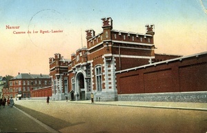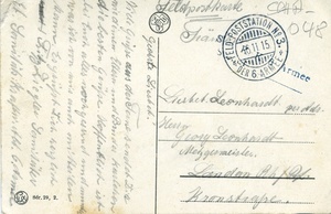 Die Vorderseite der Feldpostkarte zeigt den kolorierten Druck des Eingangtors der Caserne du 1er Rgmt.-Lancier in Namur (Belgien). Auf der Rückseite befindet sich eine handschriftlich verfasste Nachricht von Fritz Ziegler an Fräulein Lisbeth Leonhardt in Landau (Pfalz). Der Feldpoststempel ist vom 16.11.1915. Im Historischen Museum der Pfalz war vom 29.4.2014 bis 24.9.2017 die Ausstellung "1914 - 1918. Die Pfalz im Ersten Weltkrieg" zu sehen. Auf einen öffentlichen Aufruf hin meldeten sich zahlreiche Privatpersonen, ihre Objekte wurden in dieser Sammlung erfasst und z. T. auch in der Ausstellung gezeigt. Die Objekte befinden sich im Eigentum der Privatpersonen und sind nicht Teil der Sammlungen des Historischen Museums der Pfalz.
