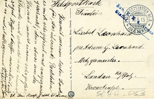 Die Vorderseite der Feldpostkarte zeigt einen kolorierten Druck des Rathauses von Diksmuide (fran. Dixmude). Dixmuide ist eine Stadt in Westflandern Belgien. Auf der Rückseite befindet sich eine handschriftlich verfasste Nachricht von Fritz Ziegler an Fräulein Lisbeth Leonhardt in Landau (Pfalz). Der Feldpoststempel ist vom 16.8.1915. Im Historischen Museum der Pfalz war vom 29.4.2014 bis 24.9.2017 die Ausstellung "1914 - 1918. Die Pfalz im Ersten Weltkrieg" zu sehen. Auf einen öffentlichen Aufruf hin meldeten sich zahlreiche Privatpersonen, ihre Objekte wurden in dieser Sammlung erfasst und z. T. auch in der Ausstellung gezeigt. Die Objekte befinden sich im Eigentum der Privatpersonen und sind nicht Teil der Sammlungen des Historischen Museums der Pfalz.