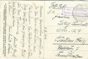 Die Vorderseite der Feldpostkarte zeigt den Druck einer Aufnahme der durch die russ. Armee zerstörten Stadt Stallupönen in Ostpreußen aus dem Jahr 1914. Auf der Rückseite befindet sich eine handschriftlich verfasste Nachricht von Edwin (?) an Fräulein Lisbeth Leonhardt in Landau (Pfalz) vom 7.2.1916. Der Feldpoststempel ist vom 9.2.1916. Verlag Gebrüder Hochland, Königsberg i. Pr. Originalaufnahme von Hofphotograph A. Kühlewind, offizieller Kriegsphotograph, Königsberg i. Pr. Im Historischen Museum der Pfalz war vom 29.4.2014 bis 24.9.2017 die Ausstellung "1914 - 1918. Die Pfalz im Ersten Weltkrieg" zu sehen. Auf einen öffentlichen Aufruf hin meldeten sich zahlreiche Privatpersonen, ihre Objekte wurden in dieser Sammlung erfasst und z. T. auch in der Ausstellung gezeigt. Die Objekte befinden sich im Eigentum der Privatpersonen und sind nicht Teil der Sammlungen des Historischen Museums der Pfalz.