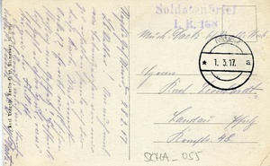 Die Feldpostkarte zeigt auf der Vorderseite ein Gruppenfoto deutscher Soldaten vor einem versteckten Artillerie-Unterstand im Wald bei Reims während des Ersten Weltkrieges. Reims lag nahe der Frontlinie, die Region war einer der Hauptschauplätze des Krieges. Nach der (aus Sicht des Deutschen Reiches missglückten) Ersten Schlacht an der Marne im Herbst 1914 gruben sich die deutschen Truppen außerhalb von Reims ein. Durch deutsche wie auch französische Artillerie sowie durch Luftangriffe wurde Reims zu etwa 60% zerstört. Auf der Rückseite befindet sich eine handschriftlich verfasste Nachricht von Werner Doetz an Fräulein Lisbeth Leonhardt in Landau (Pfalz) vom 28.2.1917. Der Feldpoststempel ist vom 1.3.1917. [Johanna Kätzel] Im Historischen Museum der Pfalz war vom 29.4.2014 bis 24.9.2017 die Ausstellung "1914 - 1918. Die Pfalz im Ersten Weltkrieg" zu sehen. Auf einen öffentlichen Aufruf hin meldeten sich zahlreiche Privatpersonen, ihre Objekte wurden in dieser Sammlung erfasst und z. T. auch in der Ausstellung gezeigt. Die Objekte befinden sich im Eigentum der Privatpersonen und sind nicht Teil der Sammlungen des Historischen Museums der Pfalz.
