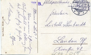 Die Vorderseite der Feldpostkarte zeigt den kolorierten Druck einer Aufnahme des Artilleriedenkmals auf dem Kaiser-Wilhelm Ring in Koblenz. Auf der Rückseite befindet sich eine handschriftlich verfasste Nachricht von R. Rolland in Koblenz an Fräulein Lisbeth Leonhardt in Landau (Pfalz). Der Poststempel ist vom 31.1.1915. Im Historischen Museum der Pfalz war vom 29.4.2014 bis 24.9.2017 die Ausstellung "1914 - 1918. Die Pfalz im Ersten Weltkrieg" zu sehen. Auf einen öffentlichen Aufruf hin meldeten sich zahlreiche Privatpersonen, ihre Objekte wurden in dieser Sammlung erfasst und z. T. auch in der Ausstellung gezeigt. Die Objekte befinden sich im Eigentum der Privatpersonen und sind nicht Teil der Sammlungen des Historischen Museums der Pfalz.