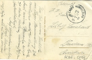 Die Vorderseite der Feldpostkarte zeigt den Druck einer Aufnahme des Truppenübungsplatzes in Hammelburg, welcher ab 1914 als Kriegsgefangenenlager für französische, belgische, russische und italienische Soldaten dient. Auf der Rückseite befindet sich eine handschriftlich verfasste Nachricht von einem gewissen Edwin (?) an Fräulein Lisbeth Leonhardt in Landau (Pfalz). Der Feldpostkartenstempel ist vom 29.7.1915. Verlag Joseph Eglau, Lager Hammelburg Im Historischen Museum der Pfalz war vom 29.4.2014 bis 24.9.2017 die Ausstellung "1914 - 1918. Die Pfalz im Ersten Weltkrieg" zu sehen. Auf einen öffentlichen Aufruf hin meldeten sich zahlreiche Privatpersonen, ihre Objekte wurden in dieser Sammlung erfasst und z. T. auch in der Ausstellung gezeigt. Die Objekte befinden sich im Eigentum der Privatpersonen und sind nicht Teil der Sammlungen des Historischen Museums der Pfalz.