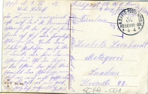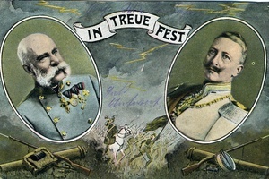 Die Vorderseite der Feldpostkarte zeigt eine kolorierten Druck mit Portraits in ovalen Rahmen von Kaiser Franz Josef von Österreich (rechts) und Kaiser Wilhelm II. von Preußen. Zwischen den beiden Portraits verläuft ein Spruchband mit den Worten "In Treue Fest". Der Bildhintergrund zeigt eine Schlachtszene. Auf der Rückseite befindet sich eine handschriftliche Nachricht von einem gewissen Jakob (?) an Fräulein Lisbeth Leonhardt vom 9.4.1915. Der Poststempel ist vom 9.4.1915. Im Historischen Museum der Pfalz war vom 29.4.2014 bis 24.9.2017 die Ausstellung "1914 - 1918. Die Pfalz im Ersten Weltkrieg" zu sehen. Auf einen öffentlichen Aufruf hin meldeten sich zahlreiche Privatpersonen, ihre Objekte wurden in dieser Sammlung erfasst und z. T. auch in der Ausstellung gezeigt. Die Objekte befinden sich im Eigentum der Privatpersonen und sind nicht Teil der Sammlungen des Historischen Museums der Pfalz.