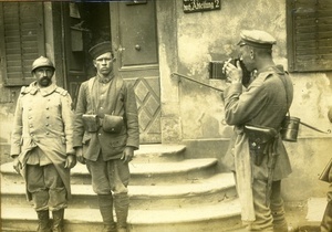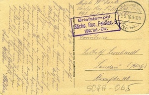 Die Vorderseite der Feldpostkarte zeigt einen langen Zug von französischen Kriegsgefangenen in Damvillers, einer kleinen Gemeinde im heutigen Département Meuse in der Region Lothringen. Die Kriegsgefangenen werden von deutschen Soldaten flankiert, auf dem Platz im Vordergrund stehen vereinzelt Trainfuhrwerke und Feldgeschütze. Damvillers liegt nur etwa 25 km nördlich von Verdun und nahe des Ostufers der Maas, einem der Schauplätze der Schlacht um Verdun und eines der opferreichsten Schlachtfelder des Ersten Weltkrieges. Die Schlacht um Verdun tobte von Februar bis Dezember 1916 und forderte mehr als 300.000 Tote. Auf der Rückseite befindet sich eine handschriftlich verfasste Nachricht von Musketier Werner Doetz an Fräulein Lisbeth Leonhard in Landau (Pfalz) vom 7.9.1916. Der Briefstempel ist aus dem "Sächs. Res. Feldlaz. 3, 192. Inf. Div.". Der Feldpoststempel ist vom 9.9.1916. Herausgegeben wurde die Karte von der Feldbuchhandlung der V. Armee. [Johanna Kätzel] Im Historischen Museum der Pfalz war vom 29.4.2014 bis 24.9.2017 die Ausstellung "1914 - 1918. Die Pfalz im Ersten Weltkrieg" zu sehen. Auf einen öffentlichen Aufruf hin meldeten sich zahlreiche Privatpersonen, ihre Objekte wurden in dieser Sammlung erfasst und z. T. auch in der Ausstellung gezeigt. Die Objekte befinden sich im Eigentum der Privatpersonen und sind nicht Teil der Sammlungen des Historischen Museums der Pfalz.