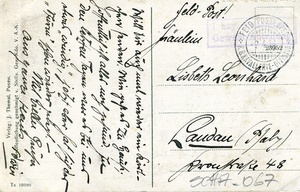 Die Vorderseite der Feldpostkarte zeigt den Druck dreier Aufnahmen des Ortes Eydtkuhnen, welcher seit 1945 unter dem Namen Tschernyschewskoje zu Russland gehörte und bis dahin Endbahnhof der preußischen Ostbahn gewesen war. Abgebildet sind verschiedene Szenen in denen jeweils deutsche Soldaten und die Beschädigungen der Stadt durch Artilleriebeschuss erkennbar sind. Auf der Rückseite befindet sich die handschriftlich verfasste Nachricht eines gewissen Edwin an Fräulein Lisbeth Leonhard in Landau (Pfalz). Der Feldpoststempel ist vom 2.4.1916. Verlag: J. Temal, Posen Veröffentlichung genehmigt v. Stellv. Gen.-Kdo. V. A.-K. Im Historischen Museum der Pfalz war vom 29.4.2014 bis 24.9.2017 die Ausstellung "1914 - 1918. Die Pfalz im Ersten Weltkrieg" zu sehen. Auf einen öffentlichen Aufruf hin meldeten sich zahlreiche Privatpersonen, ihre Objekte wurden in dieser Sammlung erfasst und z. T. auch in der Ausstellung gezeigt. Die Objekte befinden sich im Eigentum der Privatpersonen und sind nicht Teil der Sammlungen des Historischen Museums der Pfalz.