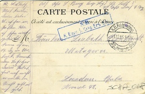 Die Vorderseite der Feldpostkarte zeigt das Tor nach St. Denis in Paris. Am Rand befinden sich handschritliche Notizen. Auf der Rückseite befindet sich eine handschriftlich verfasste Nachricht an Fräulein Lisbeth Leonhardt in Landau (Pfalz). Der Absender ist unbekannt. Der Feldpoststempel ist vom 11.12.1915. Im Historischen Museum der Pfalz war vom 29.4.2014 bis 24.9.2017 die Ausstellung "1914 - 1918. Die Pfalz im Ersten Weltkrieg" zu sehen. Auf einen öffentlichen Aufruf hin meldeten sich zahlreiche Privatpersonen, ihre Objekte wurden in dieser Sammlung erfasst und z. T. auch in der Ausstellung gezeigt. Die Objekte befinden sich im Eigentum der Privatpersonen und sind nicht Teil der Sammlungen des Historischen Museums der Pfalz.