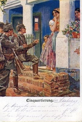 Die Vorderseite der Feldpostkarte zeigt den kolorierten Druck eines Gemäldes. Dargestellt sind drei deutsche Soldaten, die beim Eintreten in ein Haus von zwei in Frauen empfangen werden. Die eine der beiden Frauen trägt eine bunte Tracht. Die Bildunterschrift lautet "Einquartierung". Der Verfasser hat diese mit "in Serbien" ergänzt. Darunter ist eine weitere handschriftlich verfasste Notiz lesbar. Auf der Rückseite befindet sich eine handschriftlich verfasste Nachricht an Fräulein Lisbeth Leonhardt in Landau (Pfalz). Unterschrieben wurde die Nachricht von Heinrich Löw, Emil Dietz und einem gewissen Vetter Walter (Doetz?) in Minsk. Der Poststempel ist vom 25.4.1916. Im Historischen Museum der Pfalz war vom 29.4.2014 bis 24.9.2017 die Ausstellung "1914 - 1918. Die Pfalz im Ersten Weltkrieg" zu sehen. Auf einen öffentlichen Aufruf hin meldeten sich zahlreiche Privatpersonen, ihre Objekte wurden in dieser Sammlung erfasst und z. T. auch in der Ausstellung gezeigt. Die Objekte befinden sich im Eigentum der Privatpersonen und sind nicht Teil der Sammlungen des Historischen Museums der Pfalz.