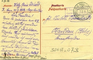 Die Vorderseite der Feldpostkarte zeigt den Druck eines Portraits des Generalfeldmarschalls von Hindenburg nach einer Zeichnung von F. Kaskeline. Auf der Rückseite befindet sich eine handschriftlich verfasste Nachricht von Unteroffizier Edwin Ehrhard an Fräulein Lisbeth Leonhard in Landau (Pfalz) vom 5.2.1916. Der Feldpoststempel ist vom 7.2.1916. Im Historischen Museum der Pfalz war vom 29.4.2014 bis 24.9.2017 die Ausstellung "1914 - 1918. Die Pfalz im Ersten Weltkrieg" zu sehen. Auf einen öffentlichen Aufruf hin meldeten sich zahlreiche Privatpersonen, ihre Objekte wurden in dieser Sammlung erfasst und z. T. auch in der Ausstellung gezeigt. Die Objekte befinden sich im Eigentum der Privatpersonen und sind nicht Teil der Sammlungen des Historischen Museums der Pfalz.